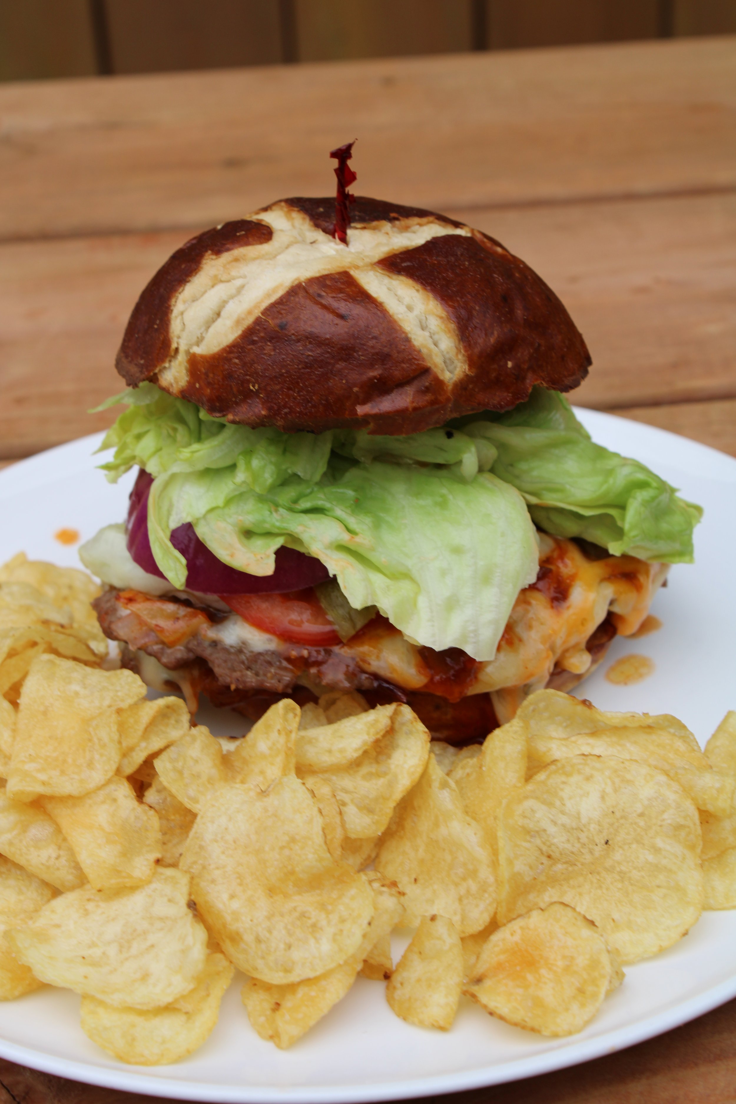 Smash Burger Two 3 oz smash patties with lettuce, tomato, onion & New Galma Dairy aged chilli pepper cheese on a pretzel bun. Topped with locally smoked jalapeño BBQ sauce & served with kettle chips.
